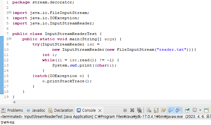 특히 System.in은 콘솔 화면에서 한글을 읽으려면 InputStreamReader를 사용해야 한다.