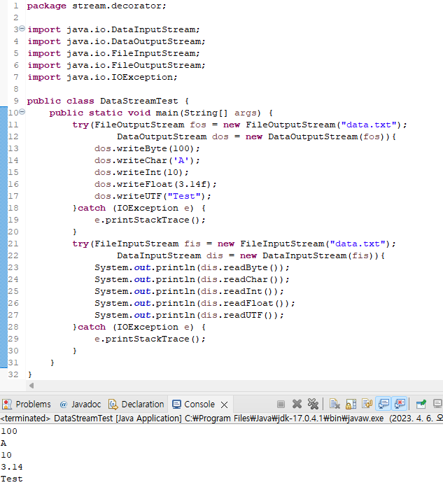 자료형을 유지하여 저장하기 위해 DataInputStream과 DataOutputStream을 보조 스트림으로 사용한다.
