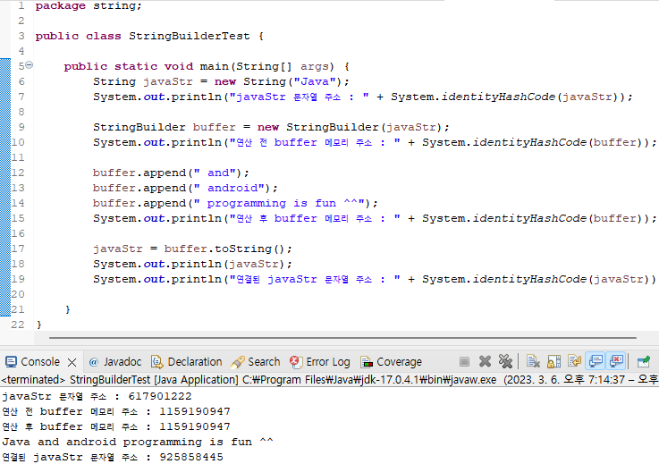 예제03 17행에서 볼 수 있듯이 문자열을 변경한 후 buffer에 toString( ) 메서드를 호출하면 다시 문자열로 반환할 수 있다.