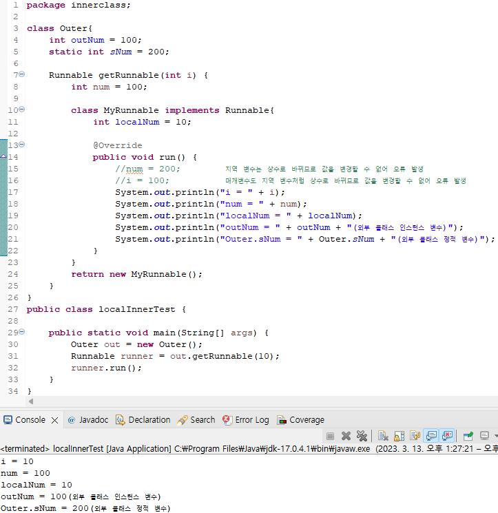 그런데 지역 내부 클래스에 포함된 getRunnable( ) 메서드의 매개변수 i와 메서드 내부에 선언한 변수 num은 지역 변수다.