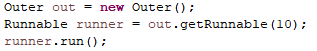 이 MyRunnable을 사용하려면 이 클래스를 직접 생성하는 것이 아니라 getRunnable( ) 메서드 호출을 통해 생성된 객체를 반환받아야 한다. (31행) _ Outer 클래스 생성 후 Runnable형 객체로 getRunnable( )을 호출한다.