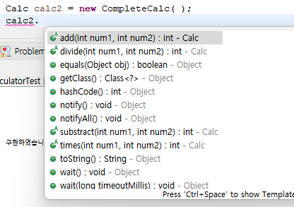 CompleteCalc 클래스는 상위 클래스인 Calculator형이면서, Calc 인터페이스를 구현하였으므로 Calc형이기도 하다.